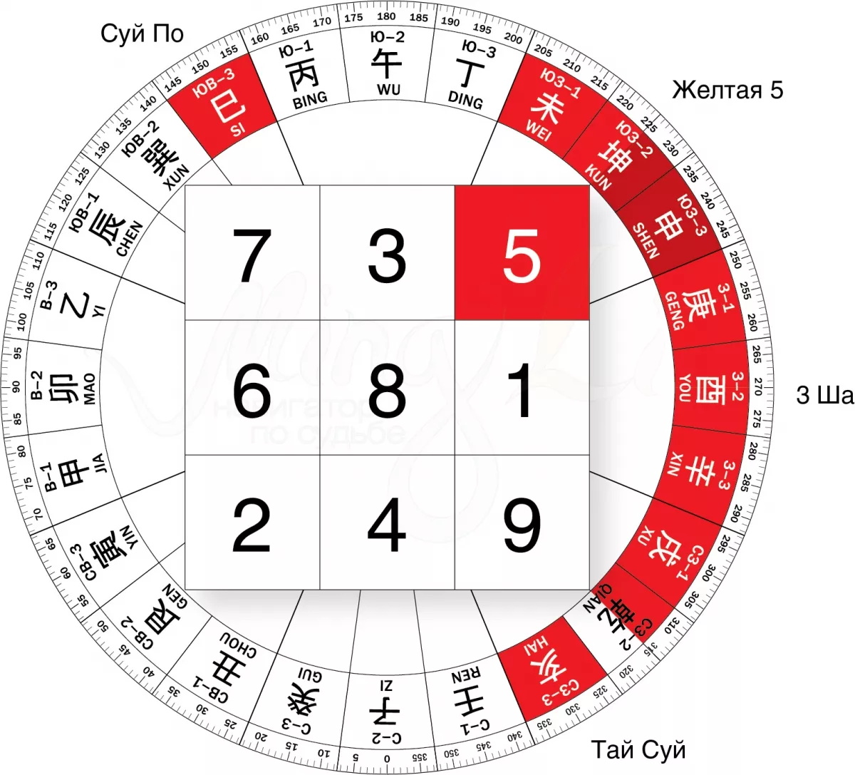 "Три ша, Сань Ша или Три убийцы – также достаточно сильная неблагоприятная энергия, которая в этом году пришлась на северный сектор. Как правило, стараются не трогать сектор 90 градусов, от середины северо-востока, до середины северо-запада."