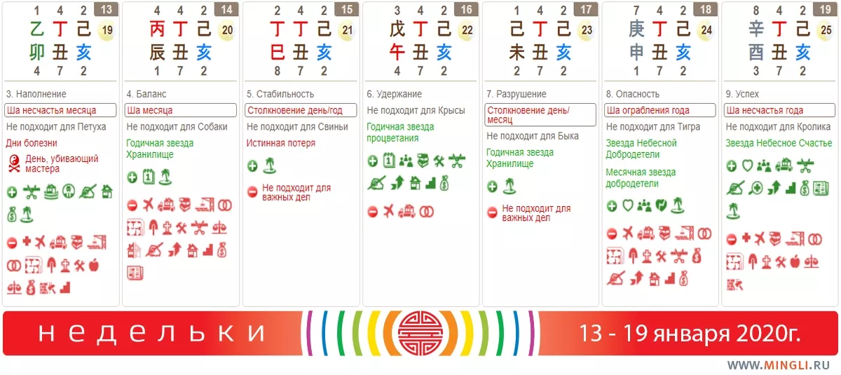 Но пойдем по порядку. Понедельник 13 января. Фэншуисты мирно отдыхают, лопань сегодня применять не стоит. А все остальные могут спокойно работать, день неплохой. Строго не рекомендовано только копать землю и заниматься экстремальными видами спорта. А так - планируйте любые позитивные дела, которых в вашей жизни должно стать больше.