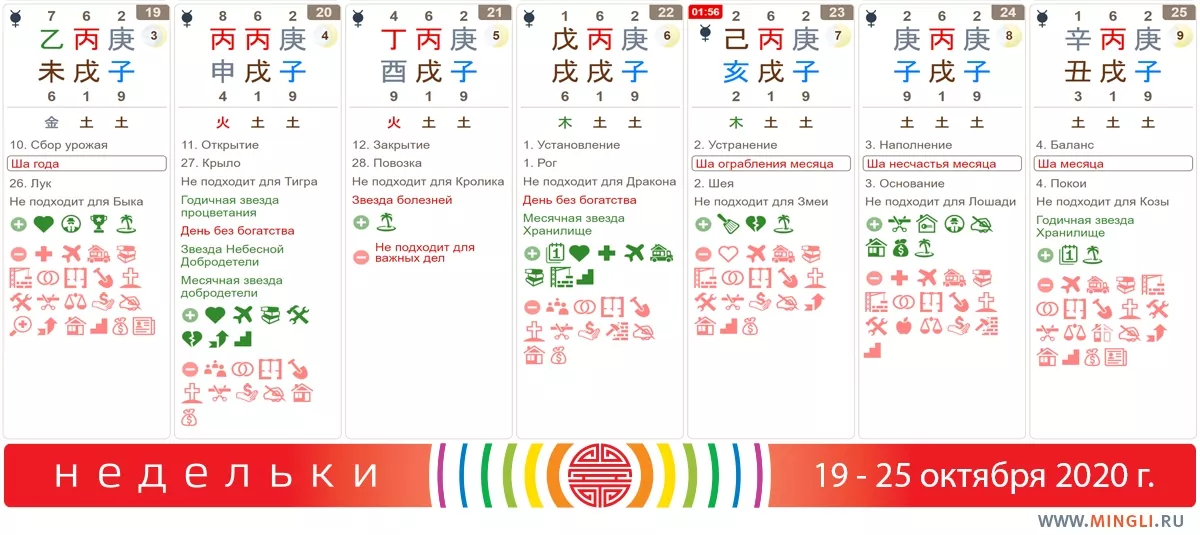 24 октября, суббота. Хороший день, не подходящий только для начала лечения и ссор с лицами противоположного пола). Наконец-то можно решать финансовые вопросы, но лучше пусть деньги приходят к вам; платить по счетам и отдавать долги сегодня не стоит. Если у вас в карте бацзы есть столп Гэн Цзы (Янский Металл на Крысе) - будьте внимательны, так как он дублируется еще и в дне. В такие периоды лучше не совершать спонтанных поступков.