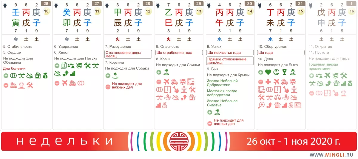 27 октября, вторник. Также хороший день, не подходящий уже Петухам. Не смотря на то, что в классических текстах его не рекомендуют использовать для свадеб, полетов и переездов, на самом деле, ограничения не такие жесткие. Просто учтите, что завтрашний день достаточно конфликтный, поэтому если сегодня ваши поступки будут необдуманными, возможно, завтра вас ждет расплата)))