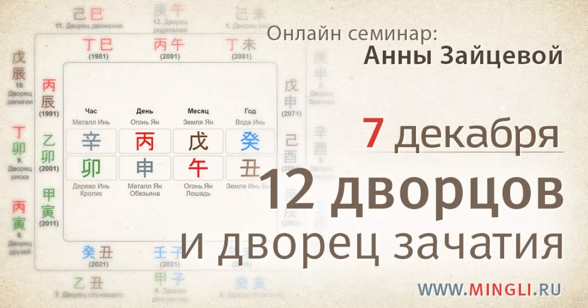 7 декабря ы 19:00 состоится семинар профессионального модуля Бацзы 12 дворцов в карте бацзы. Дворец жизни и зачатия. Используя систему 12 дворцов, мы можем увидеть дополнительные возможности для поиска отношений, улучшения финансовой удачи и многое другое.