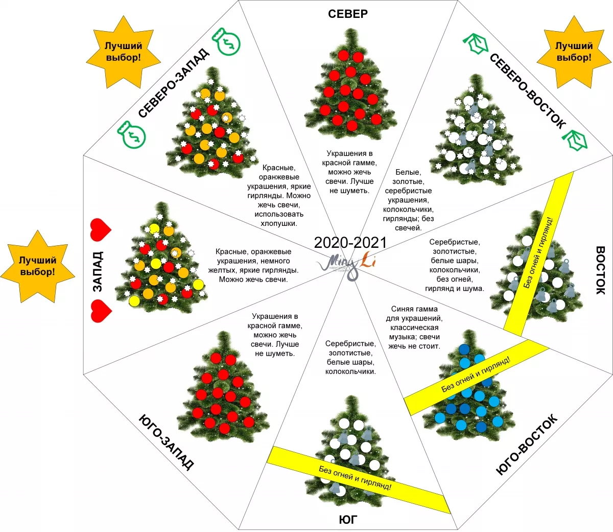 5. Ай – ёлочка может стоят только в каком-то «неправильном» с точки зрения фэн шуй углу и по-другому – никак. И правильного цвета игрушек нет. Что делать? Не расстраивайтесь, просто не надо активничать именно в этом месте с гирляндами и свечами, взрывать хлопушки. Найдите для активности хорошее место, а ёлочка пусть стоит себе и радует, такая у нее задача)