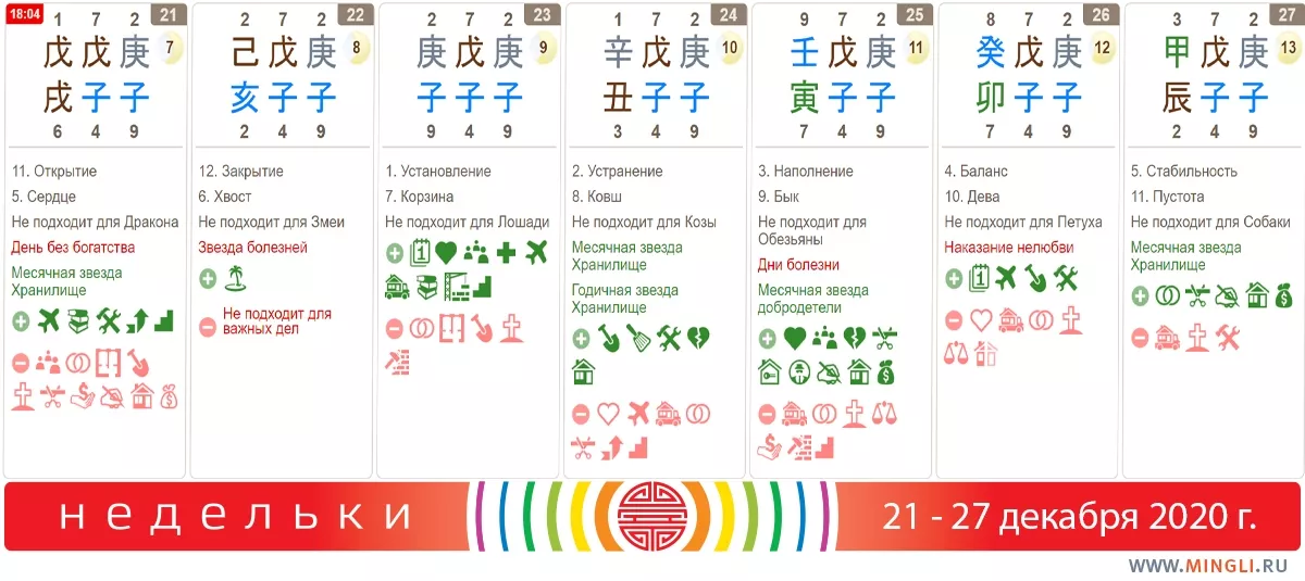 22 декабря, вторник. Сегодняшний день подойдет для повседневных и не слишком важных дней, ци для серьезного прорыва недостаточно. Однако, в дне присутствуют звезда искусств и литературы и много других поддерживающих благородных звезд, поэтому хорошо заниматься строительством, торговлей и творчеством. День не подходит для посещения поликлиник, медцентров и заболевших друзей. Берегите желудок, внимательней отнеситесь к тому, что кушаете.