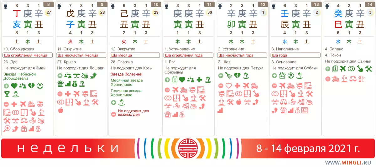 11 февраля, четверг. Дубликат месяца; если в вашей карте бацзы есть Металлический Тигр , то не стоит планировать на сегодня что-то супер важное. Металлам Ян, а также Воде лучше поберечь здоровье. Также это касается тех, для чьей карты критичен спор металла и дерева. В целом день не подходит для работы с финансами, путешествий и подписания важных документов. Общайтесь, разговаривайте, планируйте.