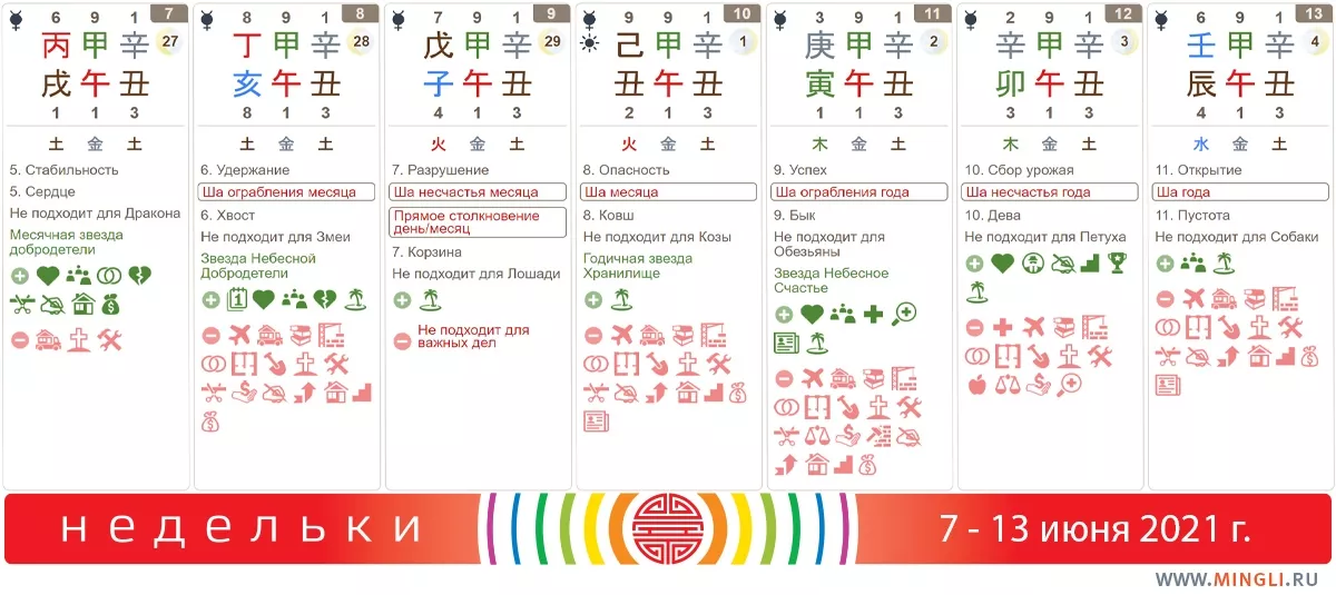 7 июня, понедельник. Отличный день. Все, кроме Драконов, могут выжать из него максимально полезную ци, которая будет способствовать бизнес делам, переговорам, свиданиям. Кому для карты бацзы нужен Огонь - можно использовать день активно. Час Тигра хорошо подойдет для активизации треугольника Огня.
