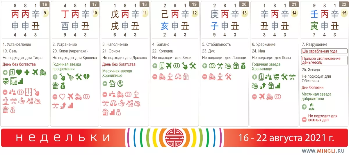 21 августа, суббота. Дубликат года, поэтому тем, у кого в карте бацзы есть иньский Металл на Быке или Козе, стоит бережнее отнестись к себе сегодня; важные решения принимать не стоит. Погружение в финансовые дела сегодня - тоже не самое лучшее решение.