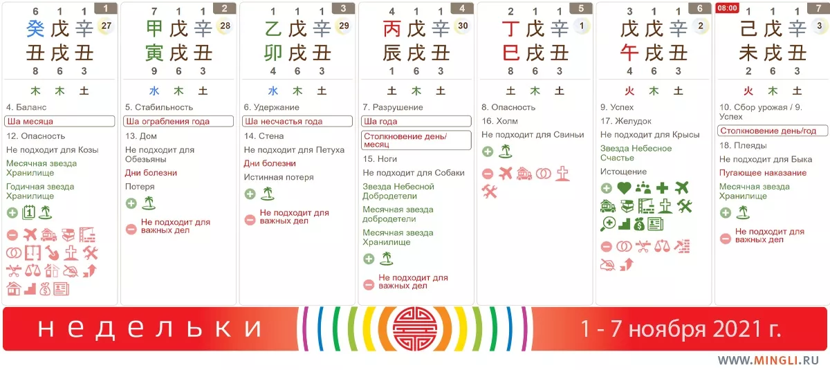 Ну что ж…Вы помните, что все еще идет месяц Собаки, ведь китайские месяцы начинаются не так, как наши привычные, европейские. Так что те, кому он не “зашел” - потерпите немножко! Месяц Свиньи начнется 7 ноября. Поэтому вся неделя больше подойдет для подготовки и планирования, а также второстепенных дел. Таков удел конца сезона. Ведь со Свиньей начинается “сторона Воды”, зимний период. Кстати! В ноябре 5 будет в центральном дворце, и обычно такие месяцы не рекомендуют для начала серьезного ремонта. Так что еще неделька, для того, чтобы его начать, есть. Лучше начинать ремонт, строительные или земляные работы в пятницу или субботу.