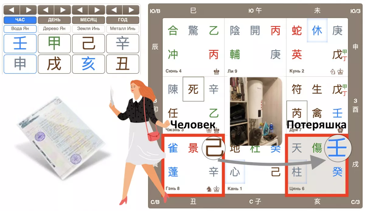 Ци Мэнь, объединяющий время, пространство и человека, позволяет рассчитать самые разные аспекты и обстоятельства. Например, при поиске пропавших вещей, можно вычислить детали, указывающие на местонахождение вещи, вероятность ее нахождения и ориентировочное время для поисков. Ко мне обратилась девушка, которая потеряла ПТС своей машины. Машина была выставлена на продажу, покупатели выехали из своего города, все обыскали, а ПТС не смогли найти. Ну что ж! Открываем расклад Ци Мэнь часа вопроса, выполняем анализ и пишем ответ: