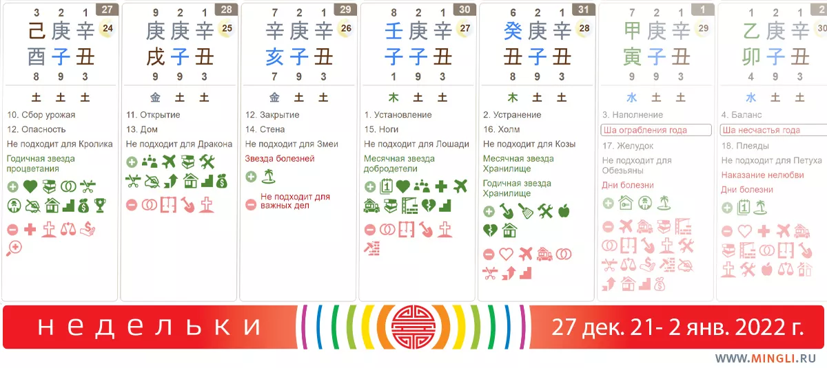 29 декабря, среда. Годится для завершения дел, подбирания “хвостов”. И… не самый лучший день для корпоратива, хотя напрашивается. Постарайтесь а). не поссориться с кем-то б). не слишком “посадить” свою ци возлияниями и прочими неумеренными развлечениями. В принципе, большие скопления народа лучше бы не посещать. Вечером, в час Собаки, прогуляйтесь на запад: расцвет во всех делах, вера в себя и помощь вышестоящих – можно смело мечтать о планах на 2022. Увидеть надо человека с тростью, кого-то, несущего на руках ребенка или же малыша, играющего с мячом. Змейкам по дню или году прогулка не подойдет, воспользуйтесь часом Обезьяны 31го декабря.