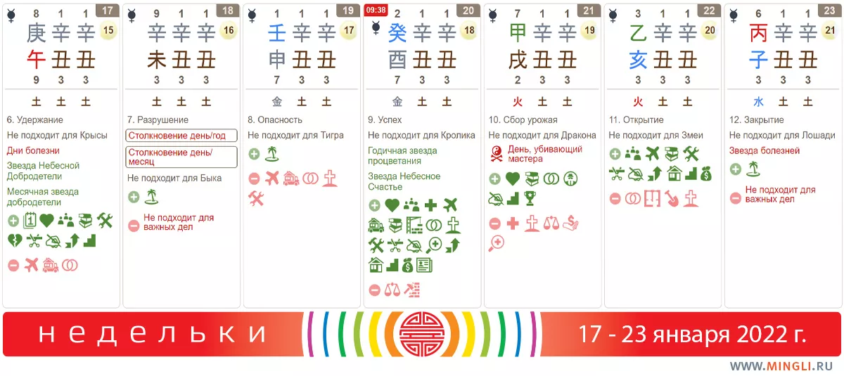 17 января, понедельник. День 庚午 очень благоприятный, его поддерживает много благородных звезд. Приносит процветание семье, рост богатства и собственности. Хорошо мириться и гасить конфликты, проводить переговоры и встречи, начинать проекты (если не можете потерпеть до конца Меркурия). Как по мне, так если затевать бизнес, то стоит быть готовым к очень конкурентной среде. Не нужно только начинать лечение и проводить много времени в местах большого скопления народа. В час Петуха прогуляйтесь на юго-запад (если не родились в год или день Крысы): энергия часа подходит для лечения болезней и исполнения желаний. Встретить вы можете человека в желтом, черном или почтальона. Особенно актуальной прогулка будет для тех, кто перечислен в описании следующего дня.
