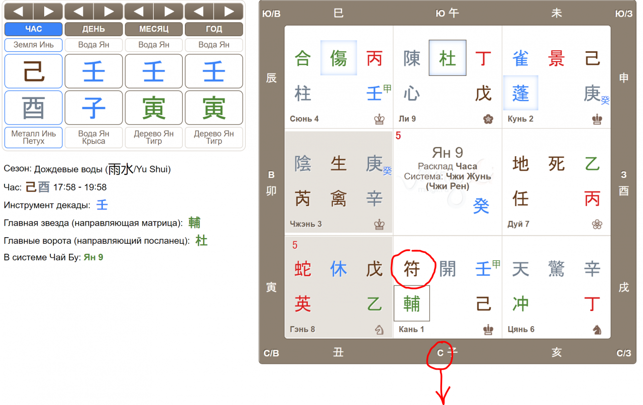 1. Если вы ничего не понимаете в Ци Мэнь, нужно уметь находить и опознавать всего один иероглиф: Главный Дух, Джи Фу 符 и именно в его направлении двигаться. Если вы уже знаете направление, то полистайте часы и выберите тот час, когда в направлении, нужном вам есть Джи Фу. Направление написано на серой рамочке.