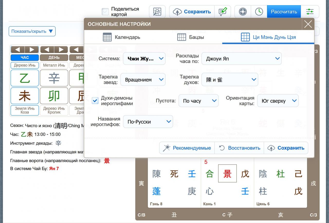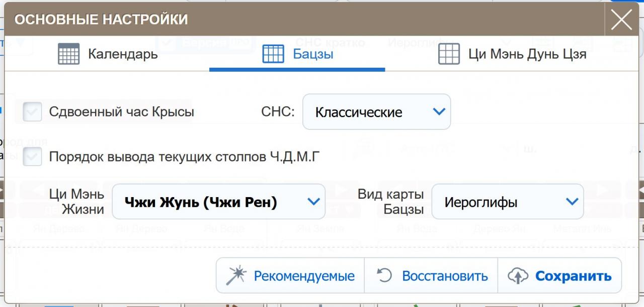 Общие настройки теперь есть в кальке Бацзы и Ци Мэнь, выведем их и в Календаре. Вы можете задать параметры, к которым вы привыкли – один час Крысы или два, расширенные снс или классические, в каком порядке выводить столпы текущей даты (а теперь ее можно посмотреть полностью, с часом!) – слева направо или справа налево. И сохранить.