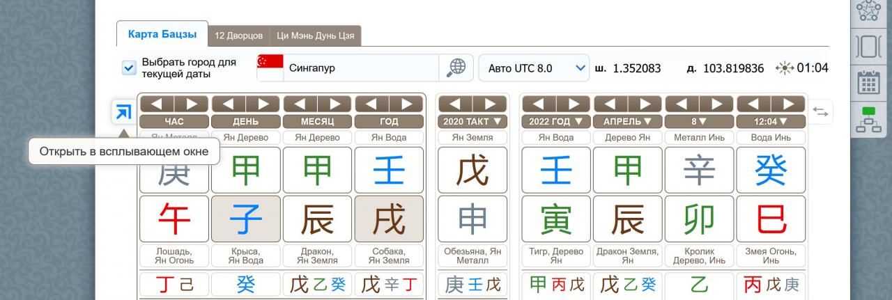 Часто бывает нужно посмотреть карту вместе со столпами какой-то даты – например, какое-то событие сопоставить с бацзы человека. Для этого теперь можно выбрать город, где произошло событие (отличный от города рождения), построить все столпы даты с днем и часом, причем эти столпы можно выстроить в удобном для вас порядке – от года к часу или наоборот.