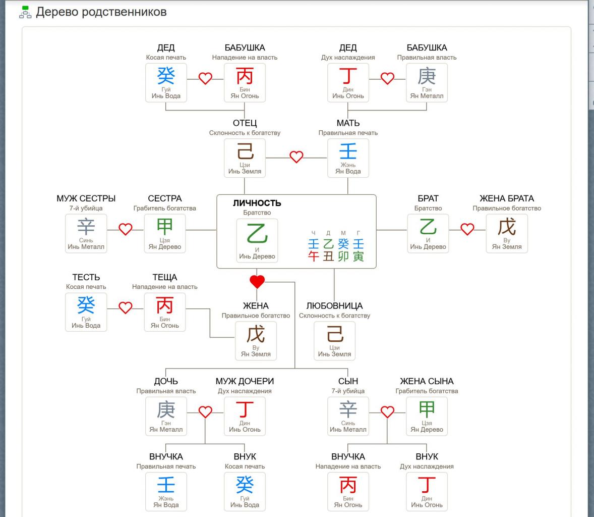Еще одна удобная милая вещичка – это дерево Родственников. Вниманию новичков: если в схеме для вашей карты муж указан как, скажем, янское Дерево – это не значит, что надо искать супруга с таким днем рождения. Схема показывает звезды родственников, то есть виртуальные образы наших пап, мам, братьев, сестер и так далее, которые можно использовать для анализа карты бацзы. Учим этому на программе «Бацзы: Путь к удаче».