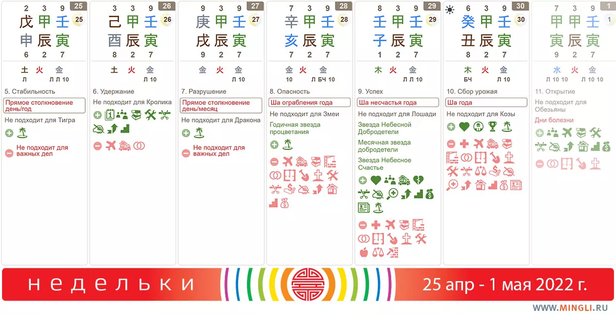 25 апреля, понедельник. День неблагоприятный, особенно для Тигров и Обезьян, а также тех, у кого в карте бацзы есть эти зверюги. Не отправляйтесь путешествовать, не вступайте в армию, не переходите на новую работу. В принципе, любые важные дела лучше перенести на потом. Тем, кто рожден в день Янской земли или в дни Металла, стоит позаботиться о своем здоровье.