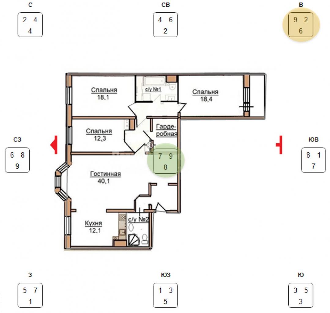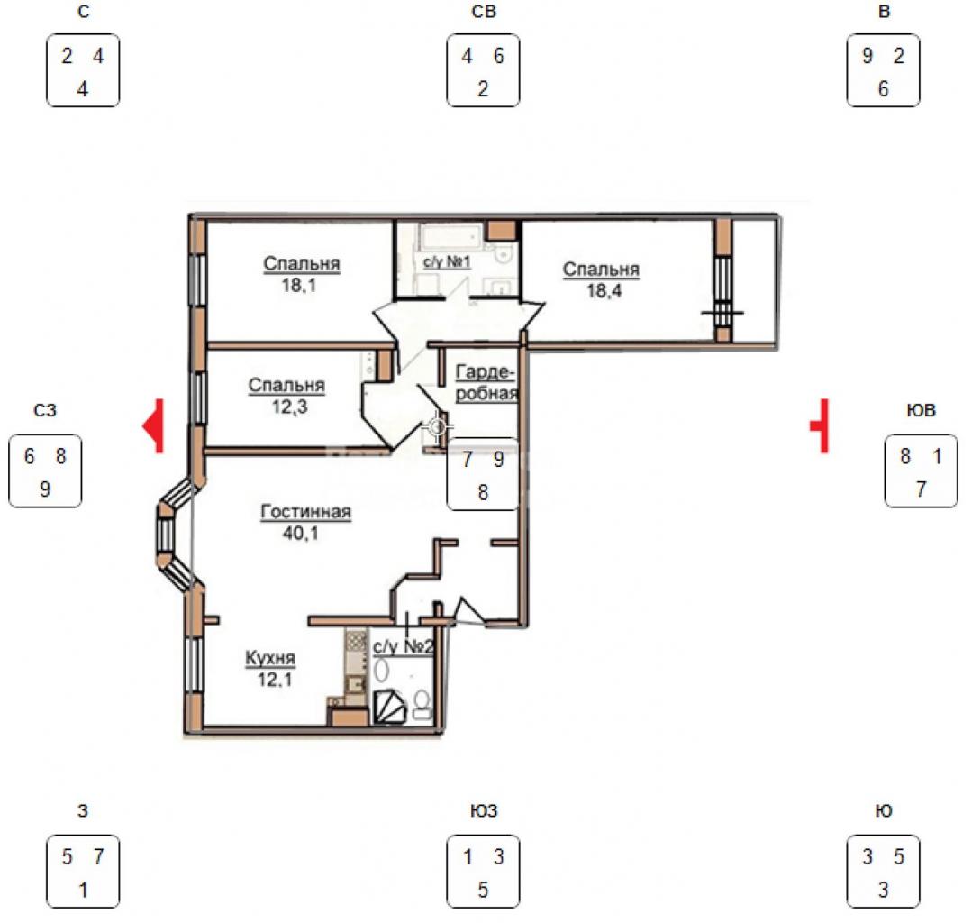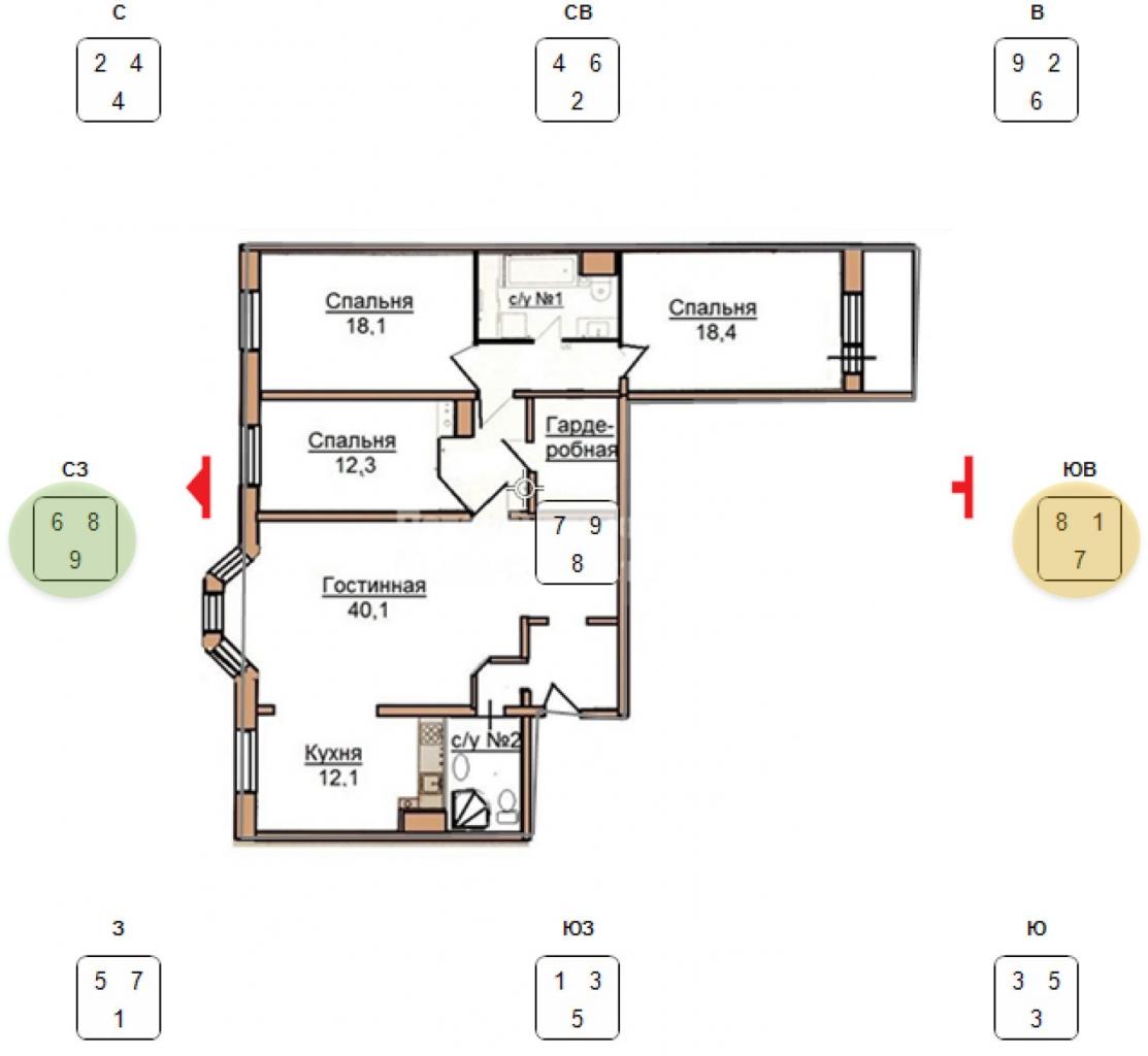 В такой квартире с деньгами все было лучше, чем с отношениями: лицевая восьмерка на фасаде поддержана активной дорогой. Горная 8 не находит себе места в квартире, но мы все еще можем ее использовать с помощью малого тайчи (если не знаете, что это, скорее записывайтесь к нам на курс Фэн Шуй 😉).