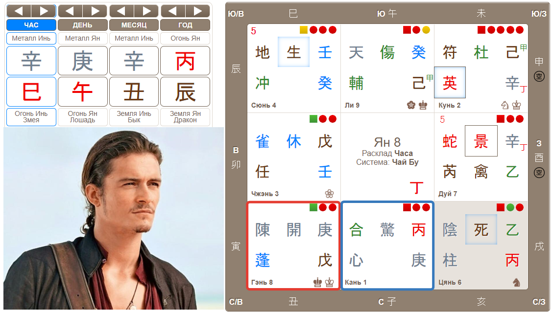 Будучи мальчишкой, Орландо мечтал стать суперменом, чтобы нравиться девочкам. Когда же понял, что супермен – это игровой персонаж, то решил, что его путь – в актеры! Кстати, актерская стезя принесла пользу здоровью. Звезда болезней 芮расположилась во дворце Дуй, данная триграмма связана со ртом и речью в том числе. Орландо страдал дислексией, а разучивание поэм, монологов, декламирование стихов, помогли ему справиться с недугом. В этом дворце находится и небесный ствол 丁– Нефритовая Дева, образ молодой девушки, женщины. Дом жизни Орландо Гэнь в порождении с домом Дуй, вот и один из значков ловеласа: женщины ему очень нравятся, он к ним тянется. Ему необходимы признание, успех у прекрасного пола, это мотивирует его на достижения. Извлечем еще информацию из дома Дуй: Орландо привлекают красивые, эксцентричные, молодые, яркие, находящиеся в кругу всеобщего внимания, а еще интересно увести женщину у соперника, у ствола месяца : -).