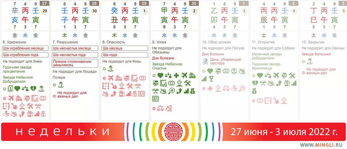 30 июня, четверг. Отличный день! Особенно для тех, кому полезны энергии Дерева и Огня. Он очень благоприятен для строительства, празднования, земляных работ, переезда в новый дом, начинания бизнеса и проектов, большинства позитивных дел. Действия, предпринятые сегодня, принесут много праздников и богатства в течение 60-120 дней. У семьи будет хорошая репутация и крепкое здоровье. Помните только, что все вышеперечисленное не касается Обезьян по году рождения. Еще одно “но” - не стоит начинать лечение и посещать заболевших друзей.