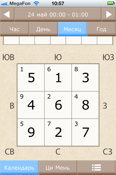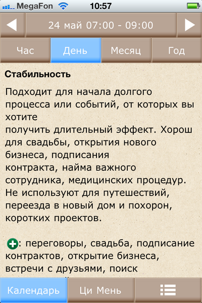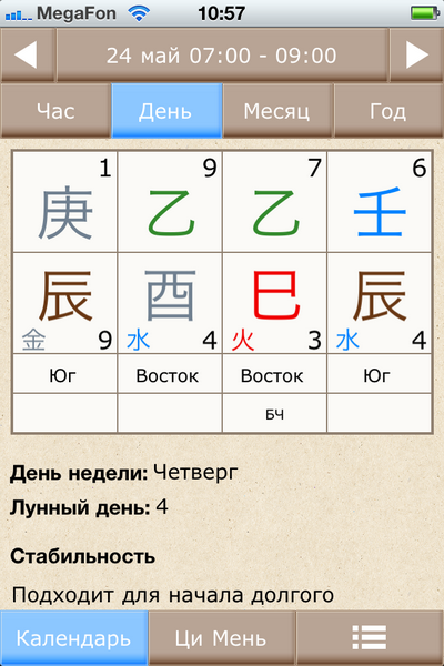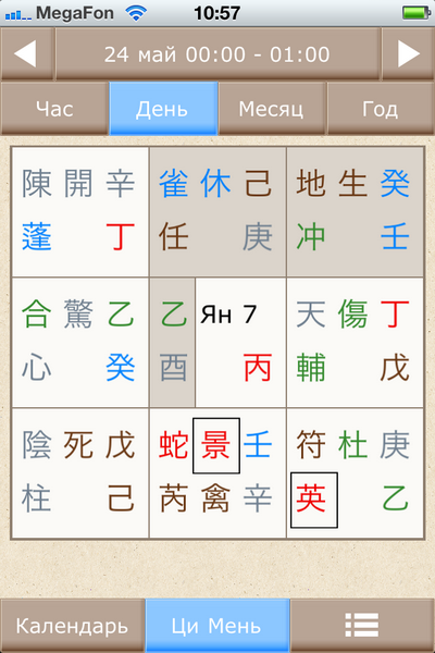 В Альманахе вы найдете описание каждого дня и часа на 2012 год с благоприятными и не очень символическими звездами, а также массу другой полезной информации - летящие звезды года и месяца, да гуа, найинь, ша направлений. Для каждого дня, часа, месяца и года вы можете посмотреть карту ци мэнь с описанием структур во дворцах. А также можно, выставляя долготу и UTC конкретного города, настроить Альманах так, чтобы он показывал ваше местное время.