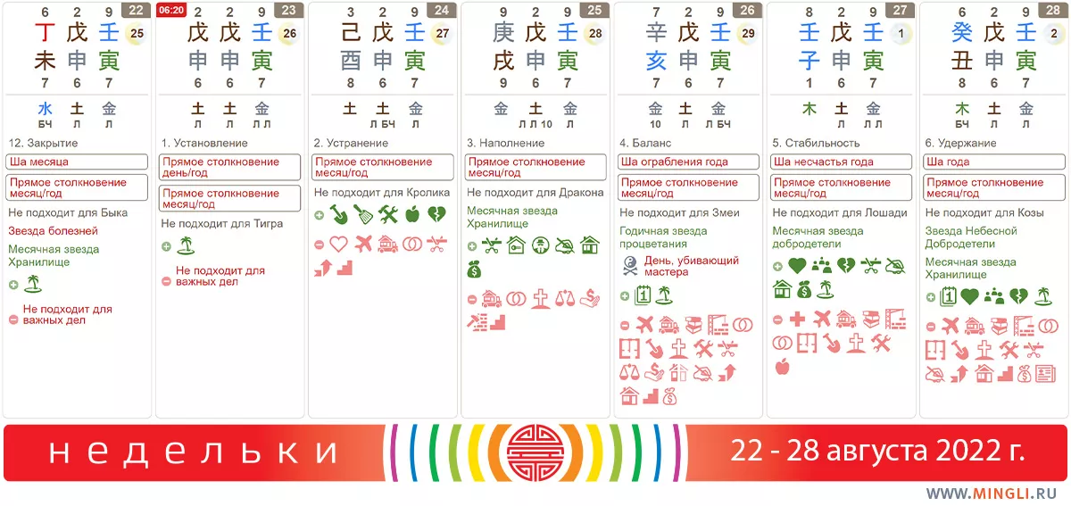25 августа, четверг. И тоже Металл и Земля правят бал. Неплохой день, если элементы благоприятны для вас - можно действовать. «Наполнение» подразумевает, что все, что вы делаете сегодня, будет множиться в вашей жизни. День хорош для ценных приобретений.