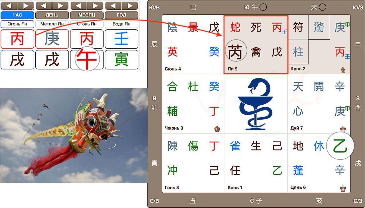 В этом же дворце расположился Небесный ствол часа - Бин, который рассматривается как дело, о котором задан вопрос, то есть болезнь. Вопрос был задан мамой о ребенке, значит Небесный ствол часа указывает также и на ребенка. Много действующих духов расклада собрались во дворце 9 Ли.