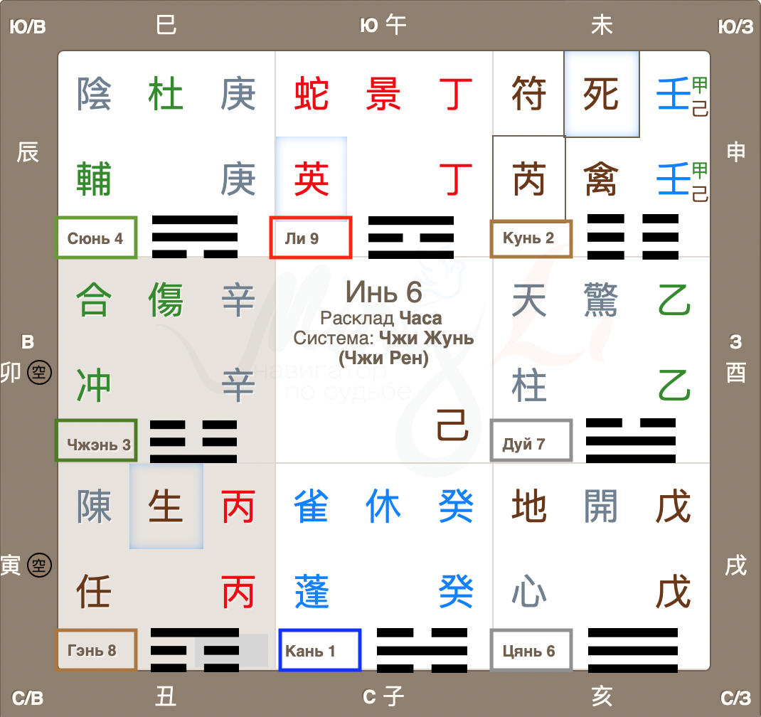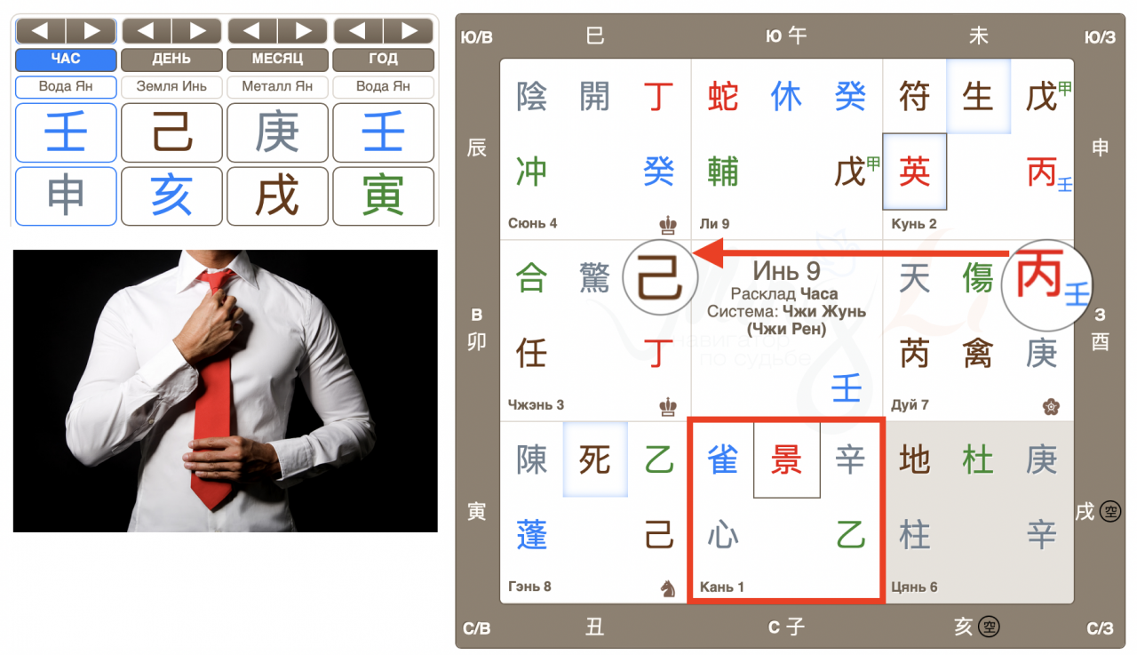 Человеку с Небесным стволом года рождения Жэнь, конечно же, нужно задействовать прекрасный дом Кунь, который дает поддержку Главного духа. В раскладе Джи Фу указывает на цель, то бишь, цель поддерживает человека Жэнь. Советуем, во время беседы, по возможности, выбрать дислокацию на юго-западе, забежим немного вперед и отметим, по факту это сделать удалось. Хорошо, это учли.