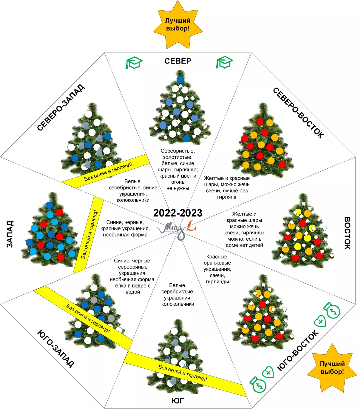 Места определяются по Летящим звездам, поэтому если вы знаете, где какие у вас живут – ориентируйтесь на свою схему. В декабре 2022 (с 7 декабря до 4 января) есть два прекрасных места, где ёлка не просто будет вас радовать, а еще и пользу приносить 😉 Север – для карьеры и учебы и юго-восток для любви и денег, выбирайте! По секрету скажу, что можно активизировать сразу оба сектора - в один ставите елку, а в другой - гирлянды вешаете или новогодний мобиль ставите.