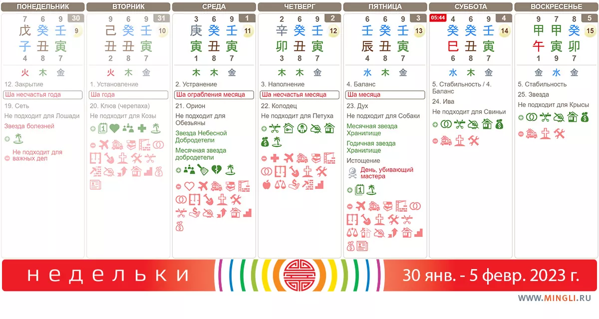 5 февраля, воскресенье. Прекрасный и довольно сильный день для строительных работ, переезда в новый дом, начала нового дела или бизнеса, путешествий, свадьбы да и большинства позитивных дел. Неожиданное богатство может быть получено в течение 60-120 дней. Большое дело принесет большую прибыль, малое дело принесет малую прибыль. Если вчера вы не отладили свой Фэн Шуй 2023 – стоит сделать это сегодня.