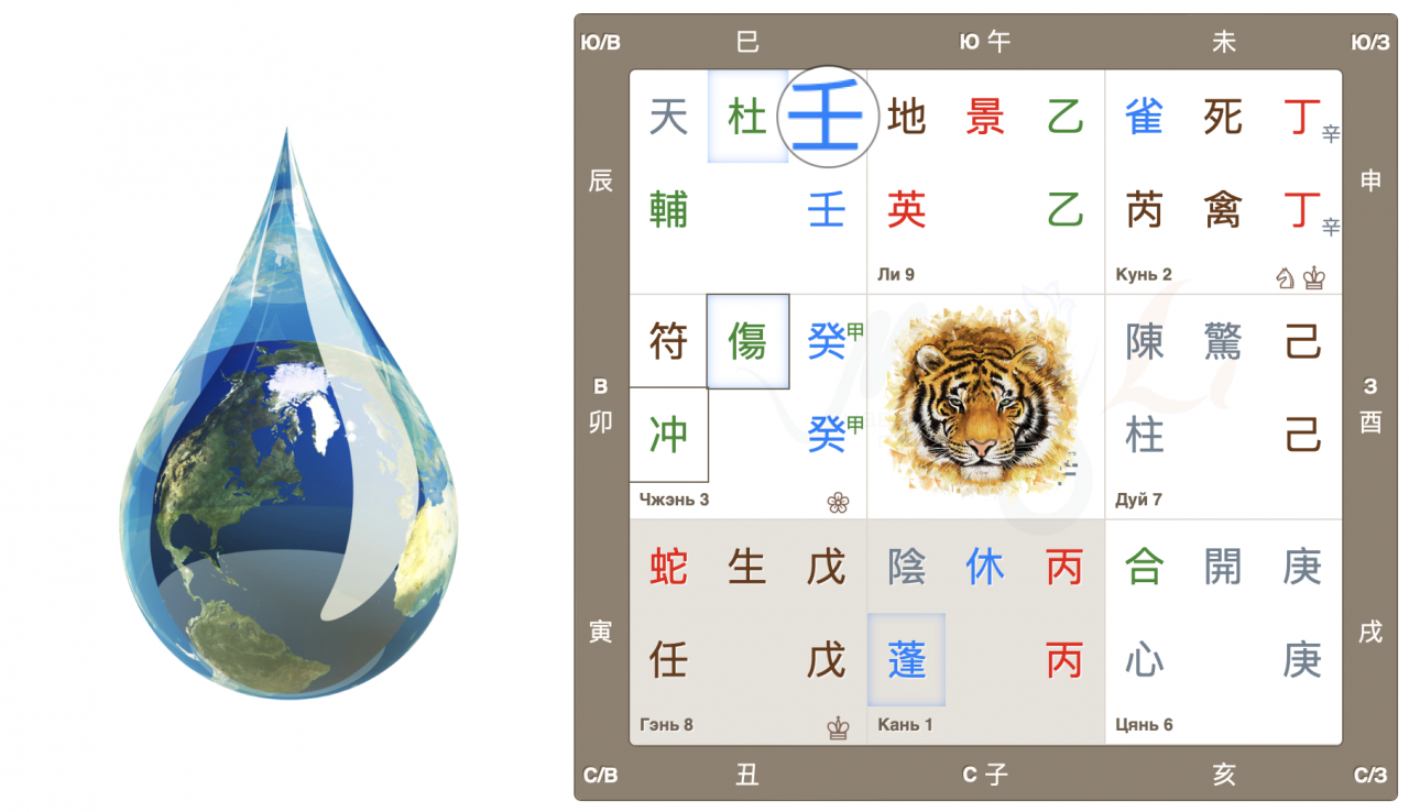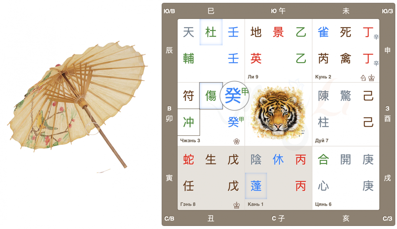 Дворец Чжэнь, движение Дерева, начало нового, быстрый рост. Врата ранения находятся в своем домашнем дворце и являются главными в раскладе. Это очень активные, азартные врата, жаждущие перемен, перемещений и поездок. Настала весна, время двигаться, и люди этого хотят. Да и родная звезда также добавляет мощный импульс для начинаний.