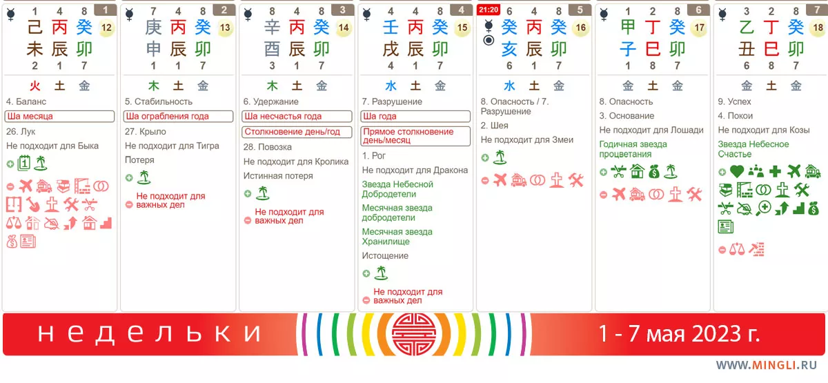 4 мая, четверг. День Истощения – недостаток ци перед началом нового сезона: сезон Дерева уступает место сезону Огня. А это значит, что энергии для эпических начал маловато. (Обратите внимание – такой день всегда предшествует началу сезона, поэтому надо смотреть, когда месяц начинается именно в вашем городе. В примере мы взяли Москву).