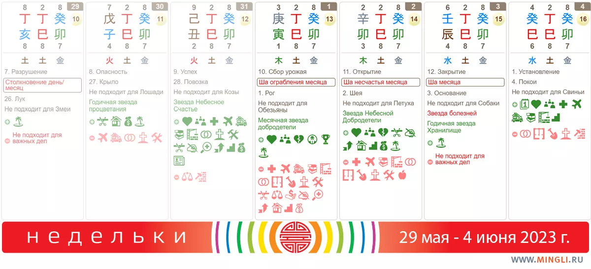 29 мая, понедельник. Лихое начало недельки, так что будьте осторожны, особенно если выходные прошли весело. Ци Огня сильно в этот день, поэтому, если уже есть проблемы с сердцем или почками – аккуратнее со здоровьем. Также показатель «зоны риска» – наличие Змеи и/или Свиньи в карте Бацзы. Важные мероприятия, как обычно, в дни Столкновений не планируем, нарушение этого правила принесет потерю богатства, болезни, судебные разбирательства и нападение из-за спины.