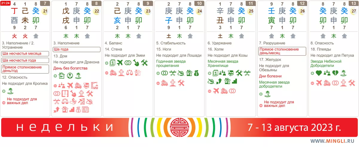 7 августа, понедельник. Будьте внимательны и осторожны. Дни начала сезона и так довольно смурные с точки зрения ци, а тут еще столкновение и ша несчастья. Поэтому, особенно если металл вам не полезен или в карте Бацзы есть Петухи-Кролики, отложите дальние поездки, медицинские вмешательства и экстремальные спорт, да и за рулем не отвлекайтесь.
