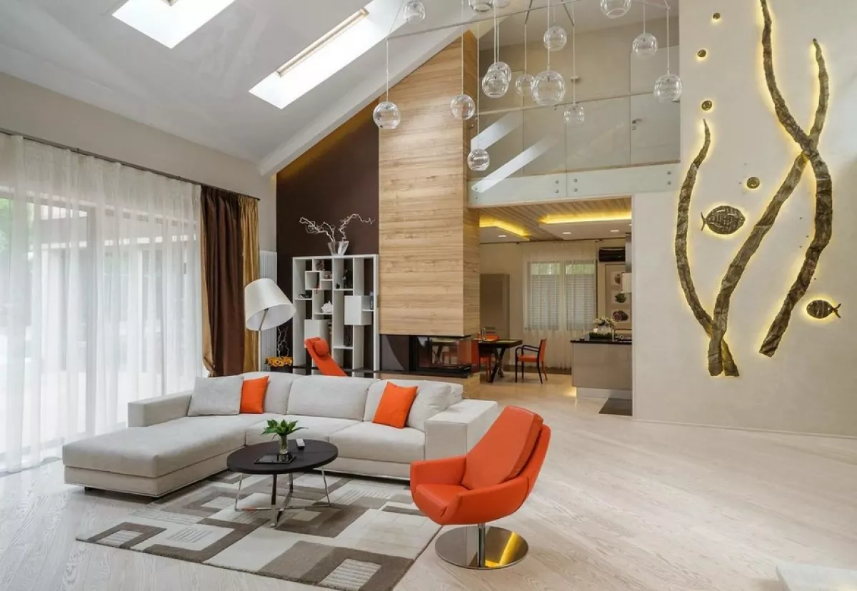 Для его использования, как и в случае с классикой, лучше иметь большое открытое пространство квартиры или дома. При разработке общей формы мы отталкиваемся от плавности линий, обтекаемости силуэтов и отказу от острых углов. Окна высокие, возможно с витражами. Лестницы широкие с большими ступенями. Отделочные материалы лучше подбирать натуральные: дерево, металл, камень, стекло, плитка. Цветовая гамма преимущественно сдержанная, преобладают спокойные тона, но для оживления применяют контрастные акценты. Но главное, что в этом стиле нет определенных схем и границ. Мы можем его дополнять различными формами, он обладает высокой функциональностью и использованием инновационных техник.