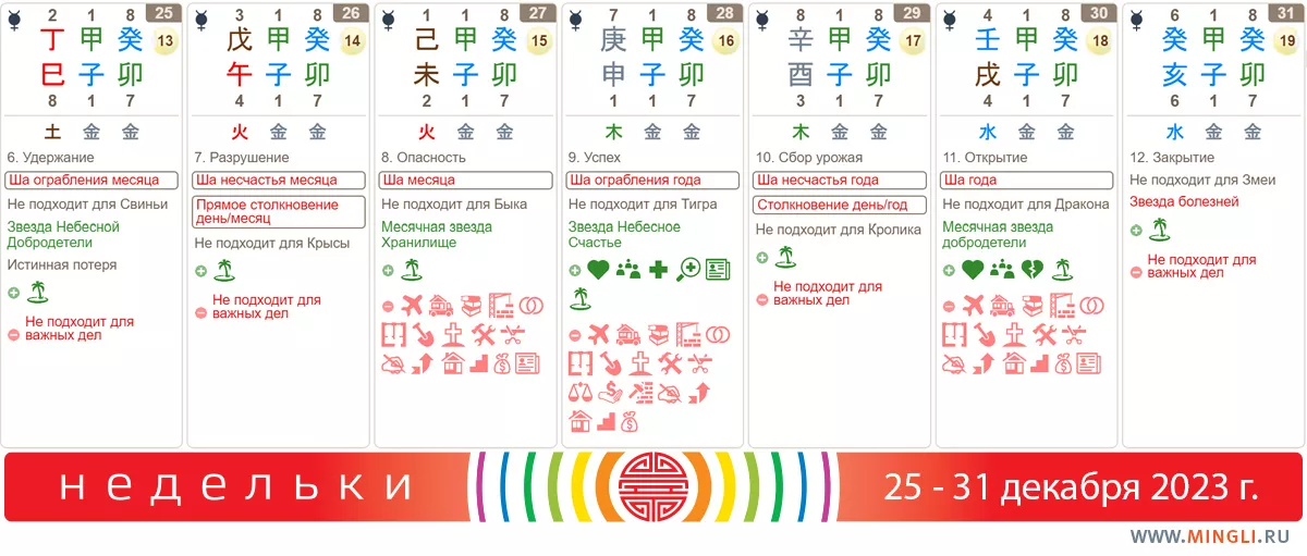 25 декабря, понедельник. Как говорят китайцы, сегодня бессмысленно что-либо начинать, так как результата не будет. Вдохновляюще 😊. В любом случае, решение финансовых вопросов, несрочные оплаты и покупки лучше отложить, как и подписание важных документов. Если сегодня вы улетаете в отпуск – присматривайте за деньгами и документами. Если Огонь вам полезен–- то результат дня может быть симпатичнее.