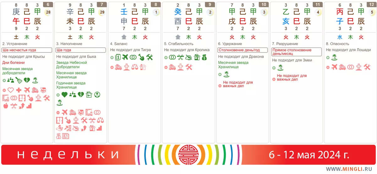11 мая, суббота. Китайцы советуют: «Не выбирайте день этого месяца. Нарушение этого правила принесет потерю богатства, болезни, судебные разбирательства и нападение из-за спины». И неудивительно – сегодня опять столкновение, на этот раз дня с месяцем. Эмоции у некоторых людей могут выходить из-под контроля, поэтому постарайтесь не задевать окружающих, особенно, если в вашей карте Бацзы есть Свинья и/или Змея. Выберите зеленый цвет для одежды – это поможет вам провести день гармоничнее.