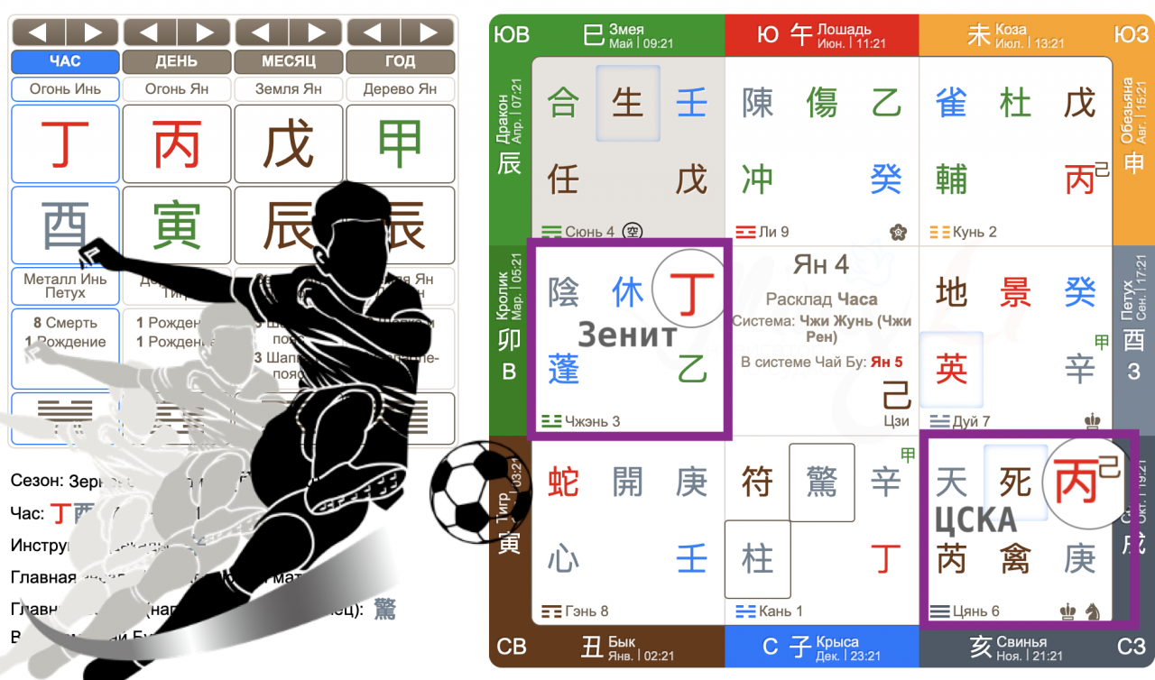 ЦСКА у нас сегодня принимающая сторона – небесный ствол Бин во дворце Цянь, а команда Зенита – небесный ствол Дин во дворце Чжэнь. На первый взгляд, ЦСКА может задавать тон игре, но давайте проанализируем подробнее.