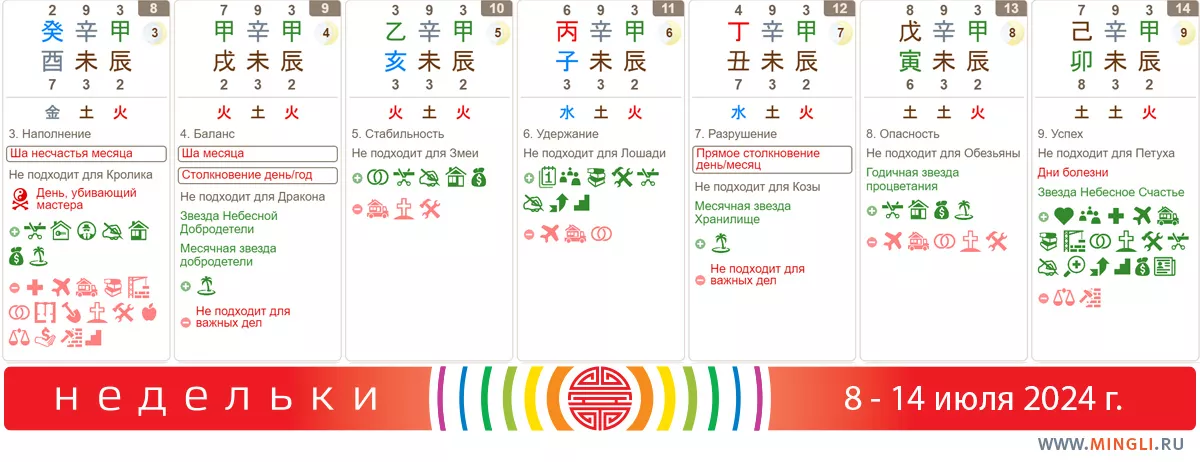9 июля, вторник. Первое из столкновений недели. Во-первых, осторожнее за рулем, во время треккинга, скалолазания да и прочих спортивных упражнений. Во-вторых, помните, что вокруг вас есть другие люди, и даже если вы соблюдаете правила дорожного движения, окружающие могут быть невнимательны. Не вступайте в конфликты. Больше всего предупреждения касаются тех, у кого в карте Бацзы есть Собаки и Драконы, особенно Деревянные. Важные дела лучше отложить на потом.