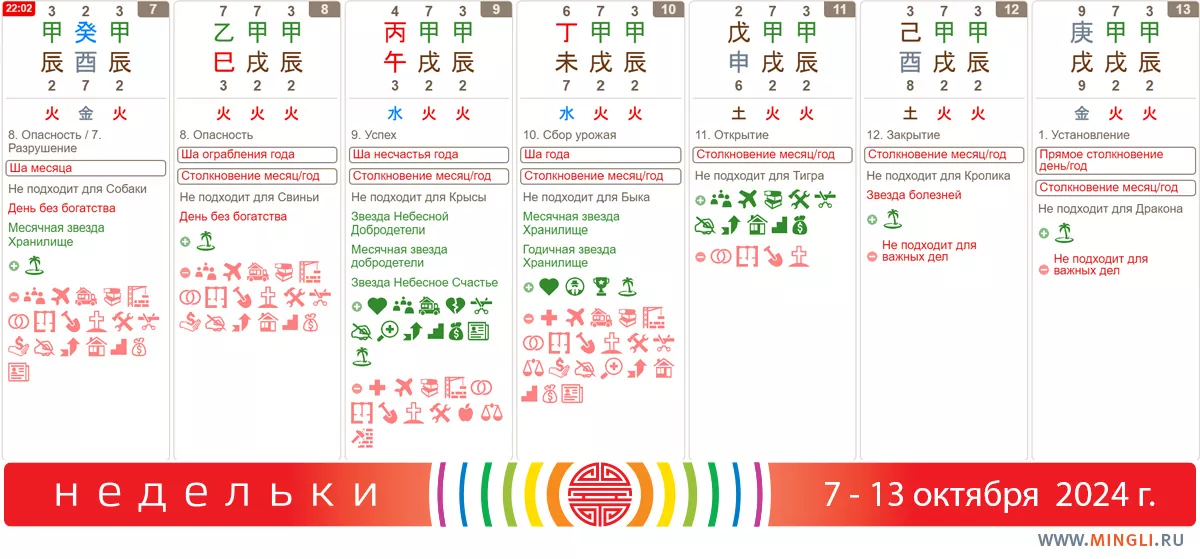 7 октября, понедельник. Смена сезона и китайского месяца; причем, как только месяц меняется, день начинает с ним сталкиваться: соберутся два Дракона и одна Собака, все деревянные. Конечно, это не означает, что события произойдут у всех сразу, необходимы предпосылки в карте Бацзы. Но, в любом случае, стоит быть бдительнее, особенно вечером, когда внимание притупляется. Финансовые вопросы также отложите на потом – сегодня день без Богатства. Кроме того, ша находится в центральном дворце, точно не стоит выбирать этот понедельник для ремонта и земляных работ.