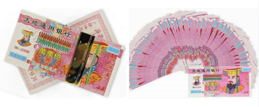 В Китае считают, что деньги предков при сжигании передаются в духовный мир, обеспечивая безбедное существование там души или духа, а также являются способом проявить любовь, уважение и воздать дань памяти усопшим, укрепляя связь с ними и принося удачу. Чем больше денег предков вы сожжете, тем проще предкам будет жить в загробном мире.