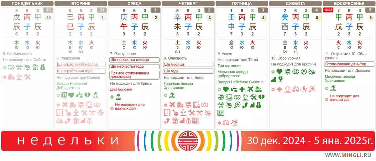 3 января, пятница. День с сильной хорошей ци, в нем много благородных звезд, поэтому он благоприятен для большинства занятий, так как приносит богатство и процветание, рождение прекрасного сына (если нужно), удаление препятствий в делах. Идея в том, чтобы сделать в этот день что-то значительное, например, начать новый проект. Также можно успешно ходить на свидания, переговоры, общаться и так далее. Особенно он хорош тем, кому полезна Вода. Только Тиграм, особенно водным, лучше повременить, выбрать другой день.