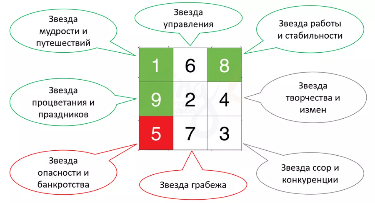 «Звезд», или типов энергии, всего 9, и их обозначают цифрами, чтобы проще запоминать – 5, 7 и 2 считаются сейчас очень плохими, 4 и 3 – просто неблагоприятными, 6 и 8 – приемлемыми, 1 и 9 – благоприятными.