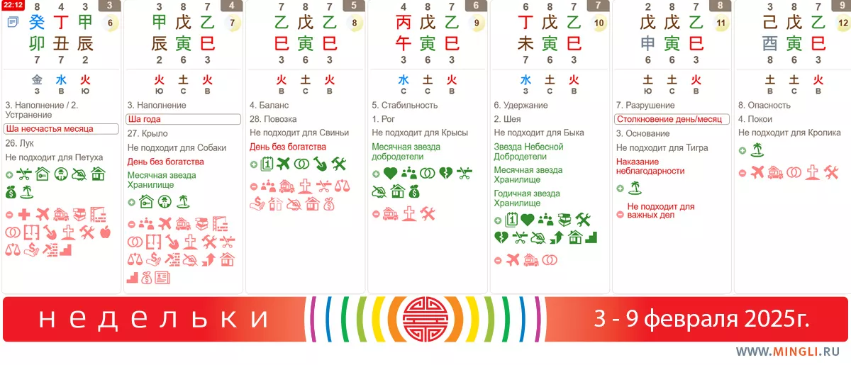 8 февраля, суббота. Лучше отдохнуть, причем максимально мирно, не посещая шумные вечеринки, отложив экстремальные спорт на лучшие времена. Не ведитесь на конфликты. В первую очередь этот совет справедлив для тех, у кого есть Тигр и Обезьяна (в первую очередь, с янской Землей наверху) или Огненное Наказание в карте Бацзы. Но и всем остальным стоит соблюдать осторожность! Важные дела, сделанные сегодня, вызывают судебные иски и споры. Если выбрать этот день для каких-либо занятий, то это может вызвать скандалы и любовные измены в течение 3-5 лет.