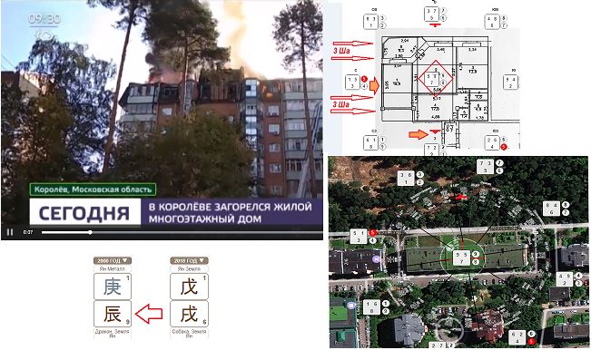 Примечателен тот факт, в совокупности к 5-9 в центре и 5-7-2 на входах, что год возведения дома 2000 – год Дракона, тогда как пожар случился в 2018 году Собаки, что образовывает прямое столкновение земных ветвей года «рождения» дома с энергиями 2018 года.