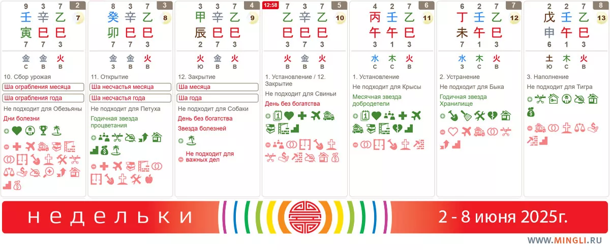 2 июня, понедельник. Сегодня хорошо возвращать себе что-то, что было вашим, а потом перешло в чужие руки. Постарайтесь не решать финансовые вопросы, не подписывать важные документы и не отправляться в далекое путешествие. Звезда болезней намекает, что лучше не задерживаться в местах большого скопления народа. Ремонт и земляные работы начинать не стоит. Час Обезьяны лучше не использовать для любых активностей, особенно если в вашей карте есть Огненное наказание. Да и самим Обезьянам сегодня надо вести себя предельно осторожно. События по Янской Воде месяца Лошади могут начаться уже сегодня.