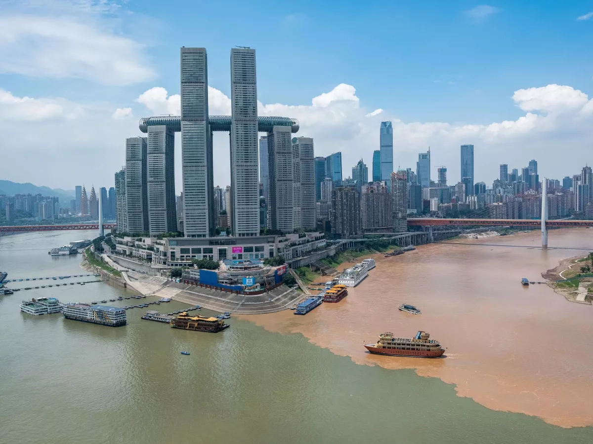 Комплекс Raffles City Chongqing располагается на остром мысу, где сливаются две реки: Янцзы и Цзялинцзян, как раз у водного рта.