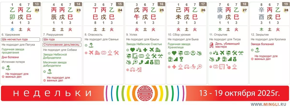 19 октября, воскресенье. А вот сегодня лучше отдохнуть, особенно Кроликам и тем, кто не любит звенящую ци Металла. Дни 酉 этого месяца в целом очень неблагоприятны для большинства дел. Максимум - завершайте то, что вы начали, и, конечно же, берегите здоровье.