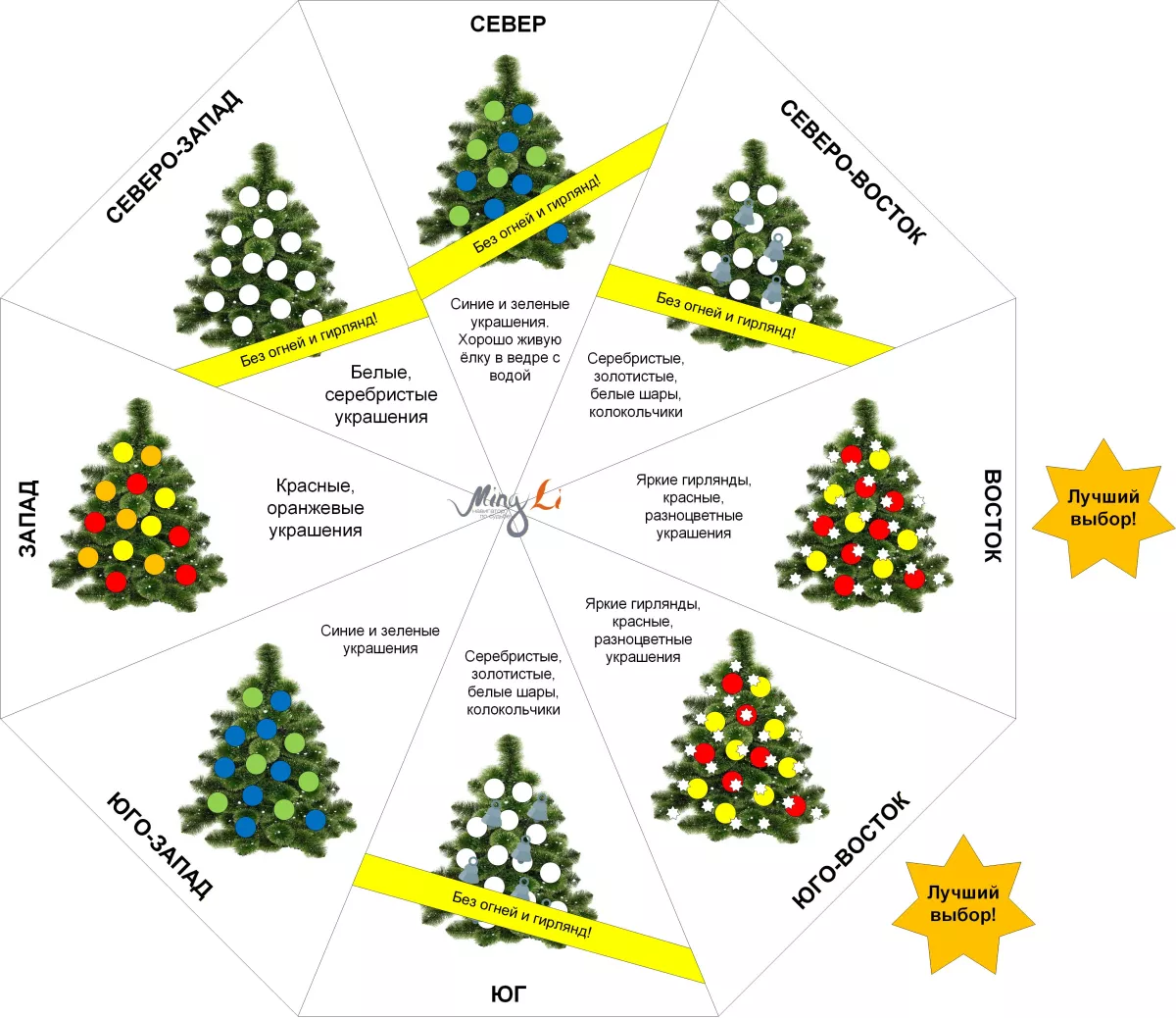Места для елочки с гирляндами определяются по Летящим звездам, поэтому если вы знаете, где какие у вас живут – ориентируйтесь на свою схему. Если не знаете, то читайте небольшой раздел про то, как найти нужные направления в этой статье.