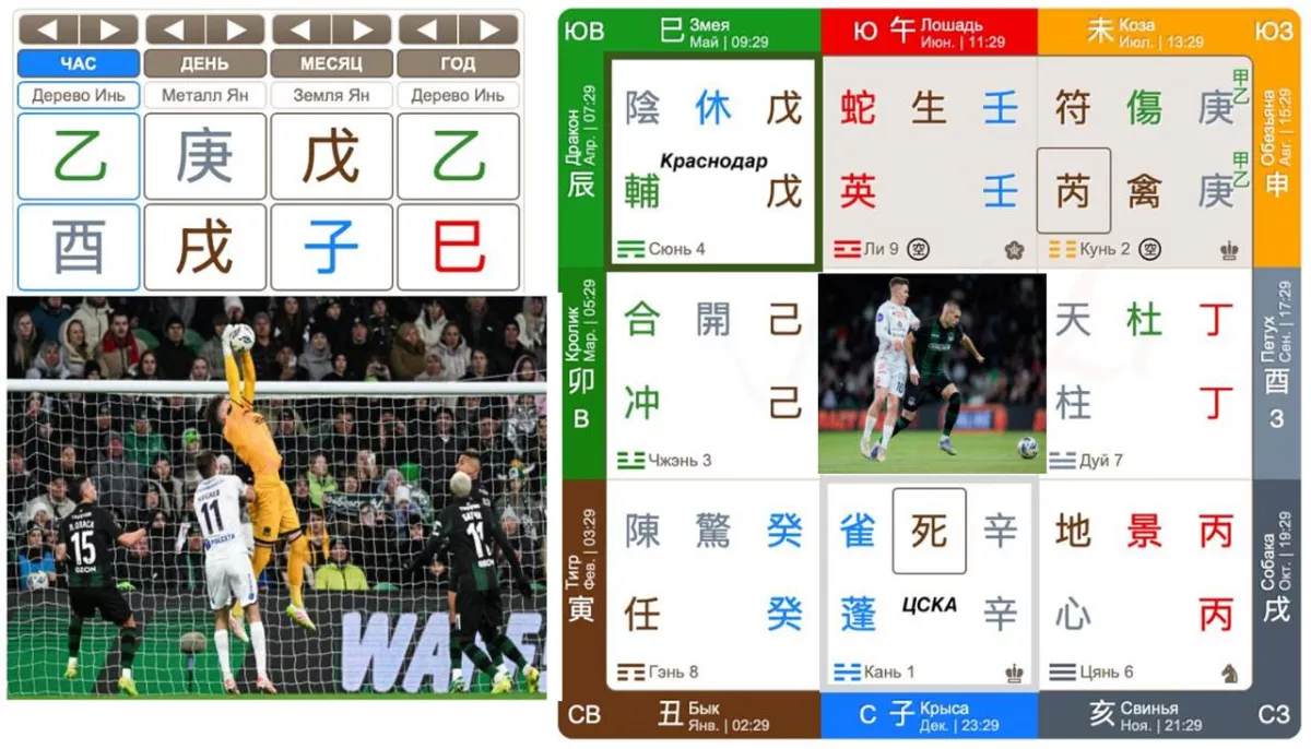 И пошло-поехало. Карта Ци Мэнь начала просто разворачиваться у меня на глазах. Наши на 11-й минуте вкатили мяч, а потом начали блуждать по полю, как поэты в поисках вдохновения (Дух 雀 ). «Краснодар» действовал чётко, как калькулятор (Дух 陰). И результаты не заставили себя долго ждать. К концу первого тайма — 1:1. Только я хотела в перерыве всё-таки разгрузиться от «ментального груза», но опять внешние обстоятельства не дали мне этого сделать. А дальше — по нарастающей. Правда, в дополнительном времени ЦСКА подсобрался и вкатил ещё мяч.