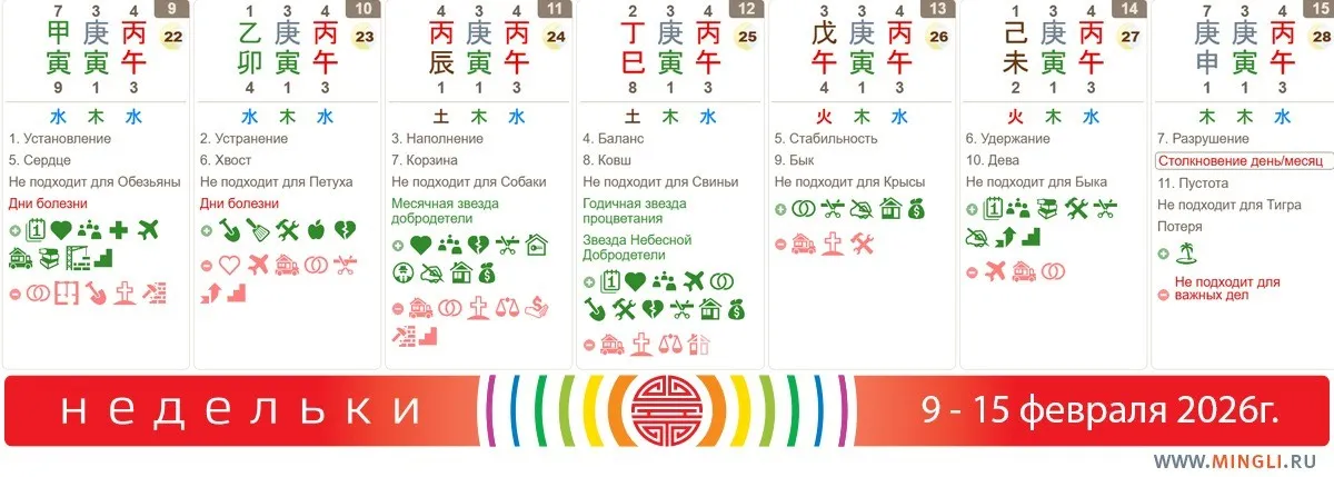 9 февраля, понедельник. Сильный день сильного Дерева, настоящий лес. Если Дерево и Огонь вам не полезны - проведите сегодня (и завтра) максимально спокойно, не “отсвечивая”). Точно не нужно устраивать свадьбы и праздники. Маленьких детей стоит беречь от травм, пожилым людям лучше отдохнуть, не посещать места скопления людей (легко заболеть). Берегите печень и желчный в эти дни, не перегружайте их. Обезьян это касается в первую очередь! Если же Дерево вам полезно и вы - не Обезьяна, то планируйте, встречайтесь, договаривайтесь, начинайте лечение; можно затеять переезд.