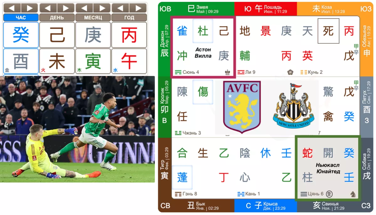 В раскладе хозяин матча - команда «Астон Виллы», представленная небесным стволом дня 己, грациозно опустилась во дворец Сюнь. А команде «Ньюкасл Юнайтед», представленной небесным стволом часа 癸 достался дворец Цянь.